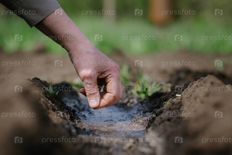 Пожилой мужчина сажает семена в саду