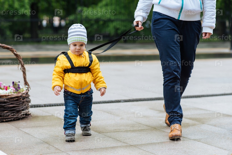 Мама страхует ребенка во время прогулки