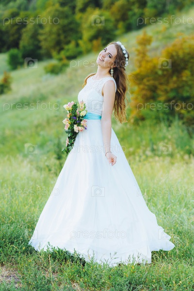 Невеста позирует для фотографа на природе