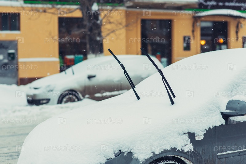 Автомобили паркуются вдоль дороги, покрытые снегом