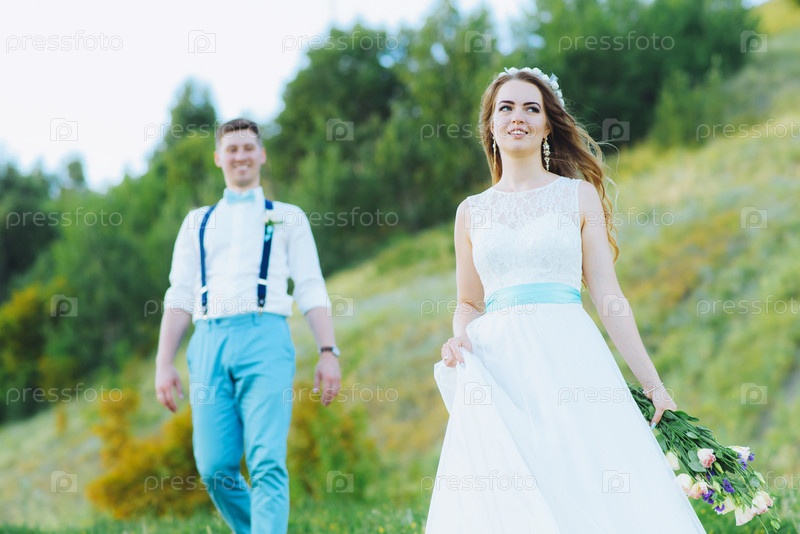 Жених и невеста фотографируются на природе