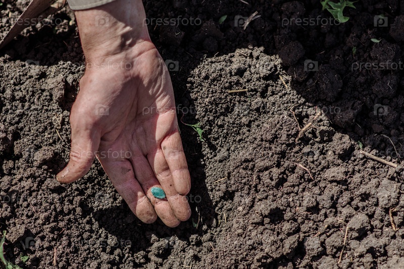 Пожилой мужчина сажает семена в саду