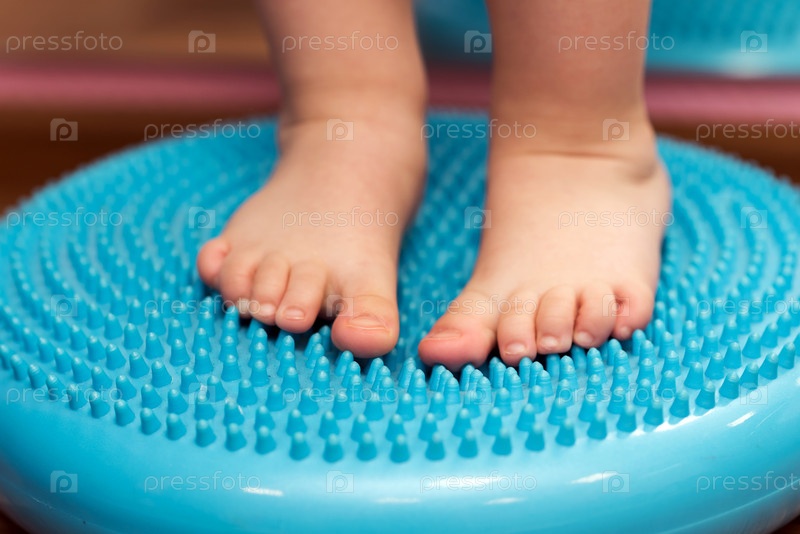Маленький ребенок стоит на массажере для ног