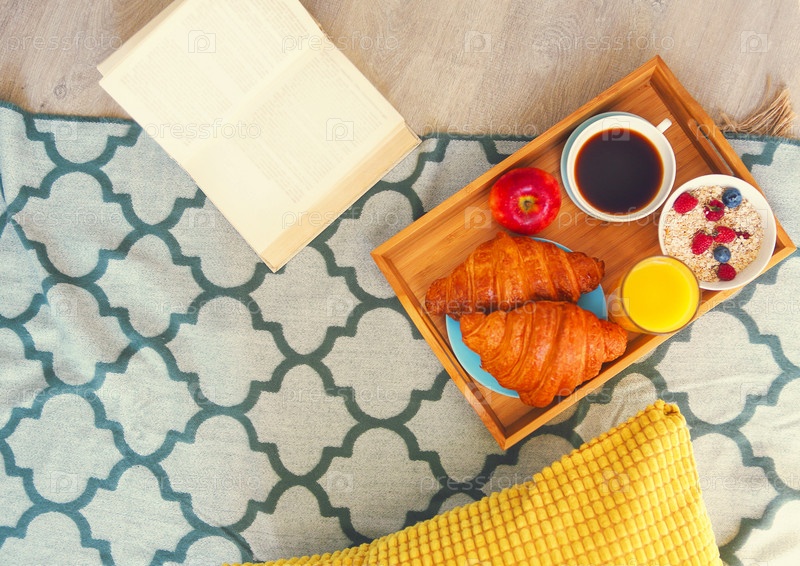Здоровый утренний завтрак на подносе с верхним видом
