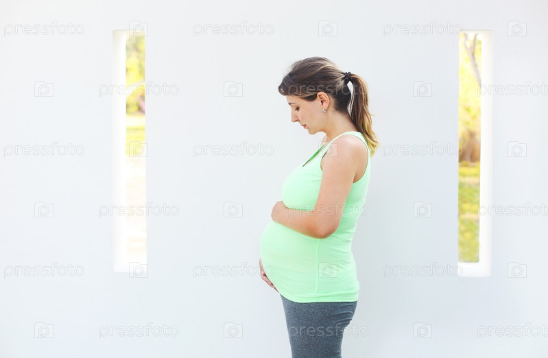 Беременная женщина касается своего живота руками
