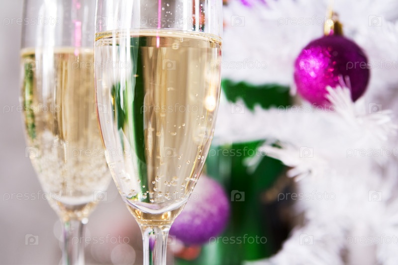Бокалы с шампанским на фоне нарядной елки