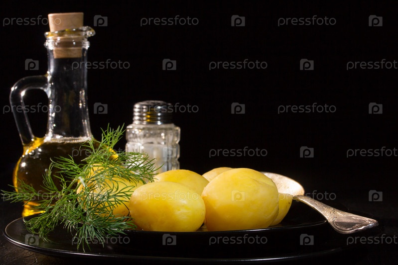 Вареный картофель, укроп, растительное масло и соль на темном фоне