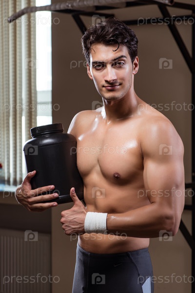Мужчина с добавками питательных веществ в спортивном тренажерном зале
