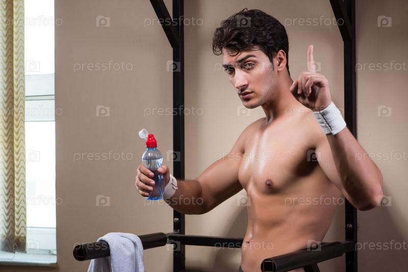 Жаждущий человек пьет воду в спортивном тренажерном зале