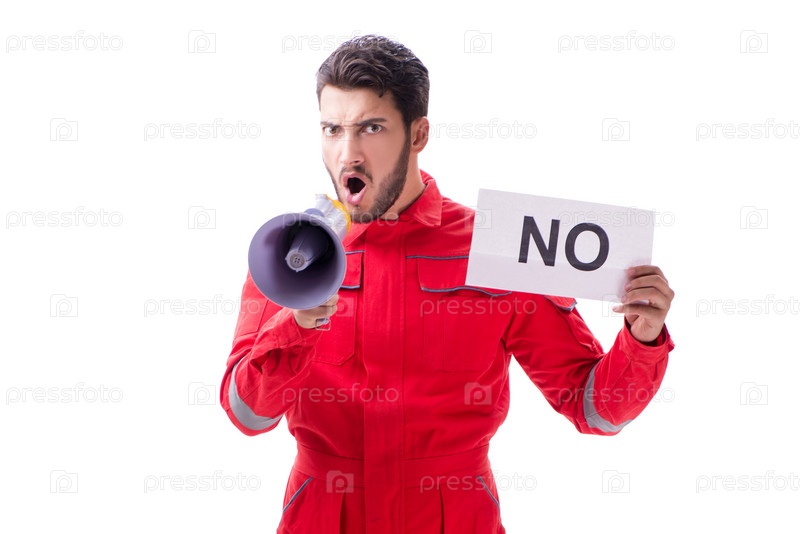 Мужчина в комбинезонах с посланием, изолированным на белом