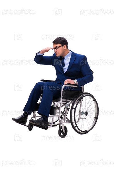 Бизнесмен с инвалидной коляской изолирован на белом фоне