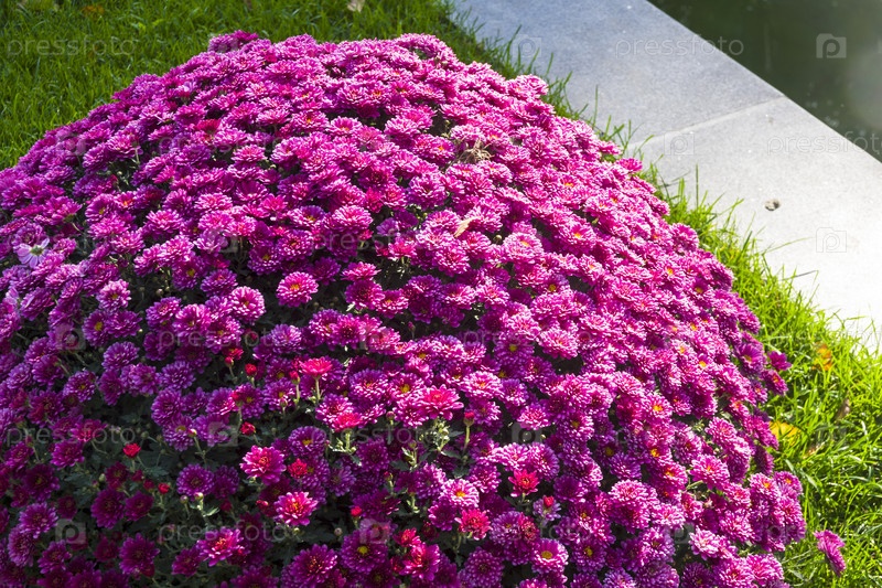 Клумба с яркими фиолетово-красными хризантемами