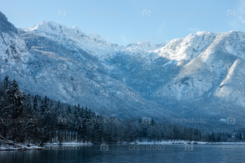 Горы со снегом на озеро