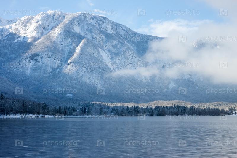 Горы со снегом на озеро