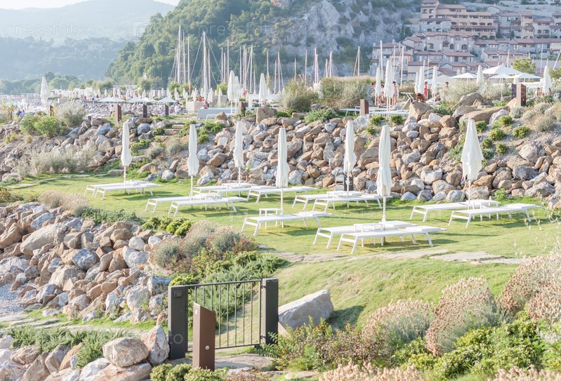 Белые шезлонги на солнечном пляже