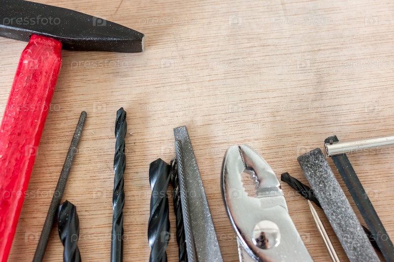 Инструменты в мастерской на деревянном фоне