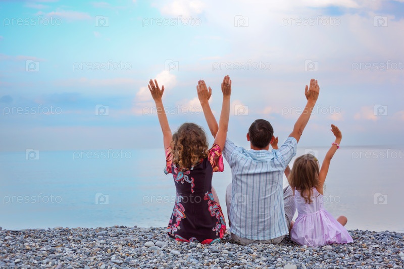 Семья на каменистом пляже, подняв руки вверх