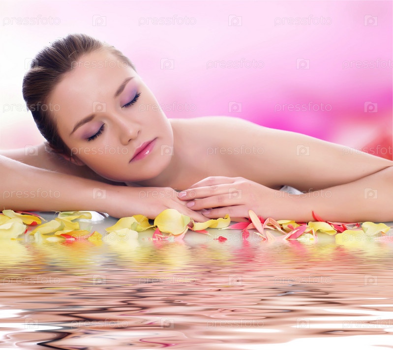 Красивая молодая девушка в лепестках роз в воде