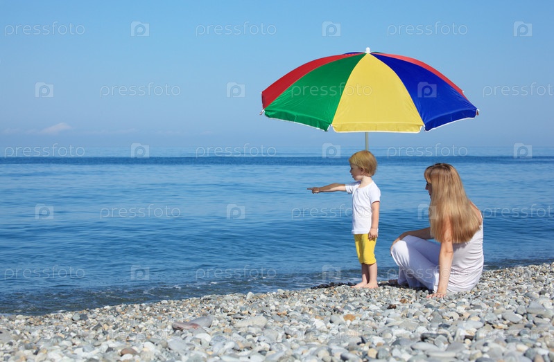 Мать с ребенком на пляже под зонтом