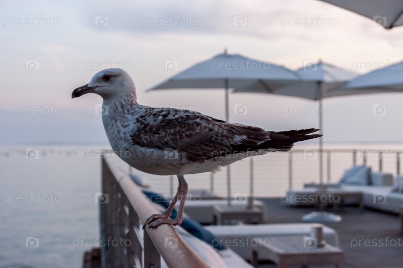 Чайка сидит на перилах красивой террасы