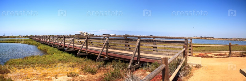 Мост через тихую и спокойную болото Bolsa Chica