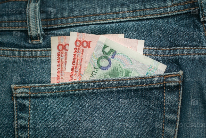 Юани в кармане джинсов. Крупный план