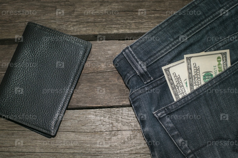 Черный бумажник и американские доллары в кармане джинсов