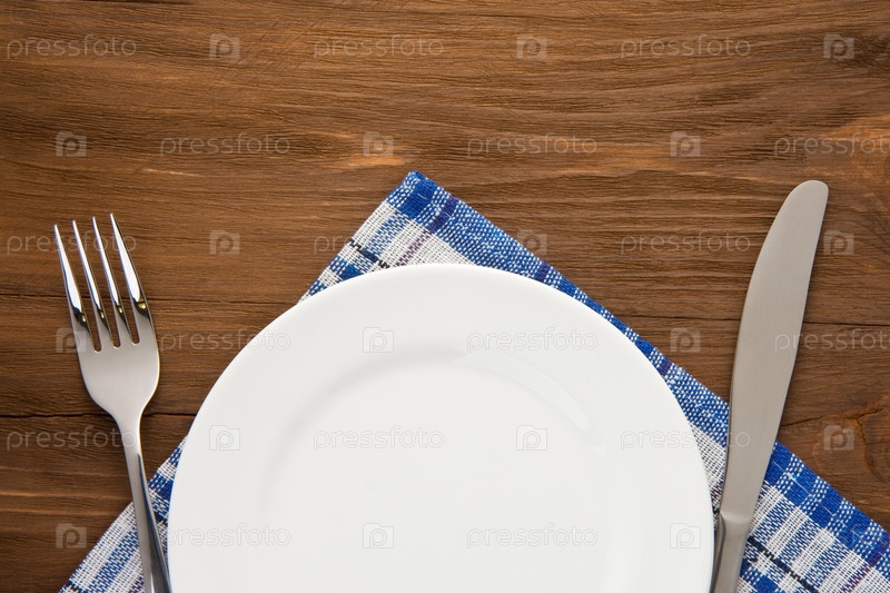 Белая тарелка, нож и вилка