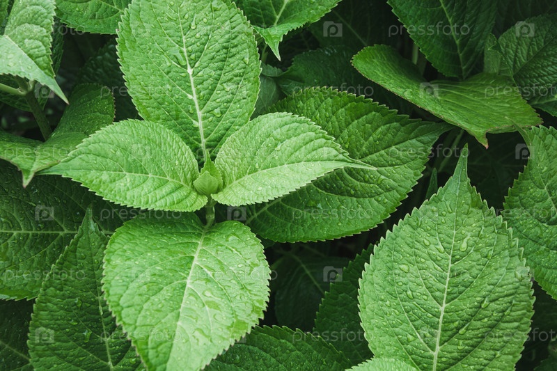 Зеленые листья гортензии с каплями дождя