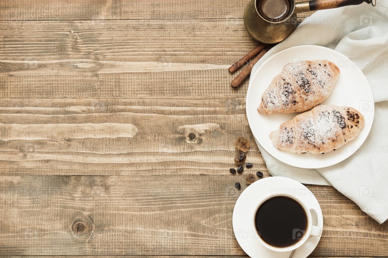 Свежеиспеченные шоколадные круассаны и чашка черного кофе
