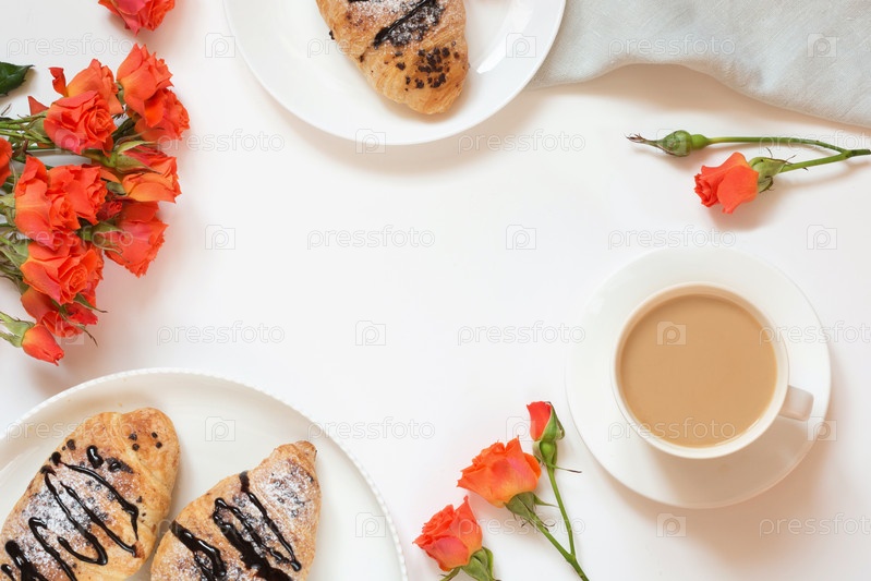 Свежеиспеченные шоколадные круассаны и чашка кофе на белом фоне