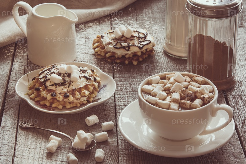 Белая чашка кофе с молоком, зефиром и домашними вафлями со взбитыми сливками