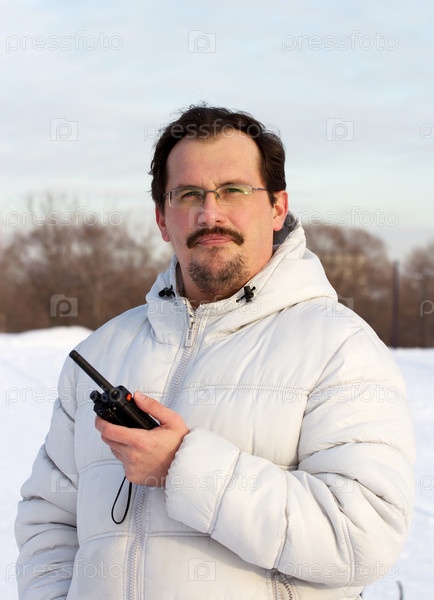 Мужчина с рацией на открытом воздухе в зимний день