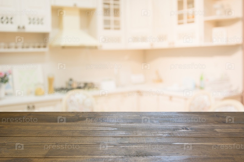 Пустые деревянные столешницы и современная кухня