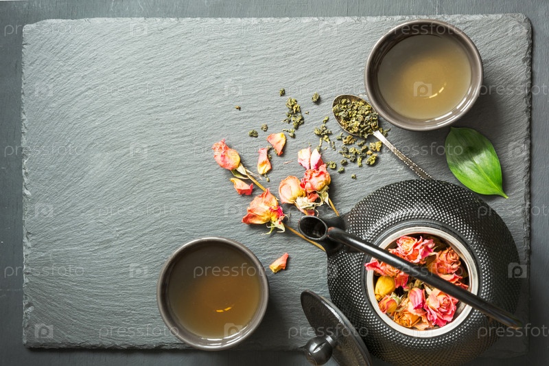 Зеленый чай с розой на черном фоне