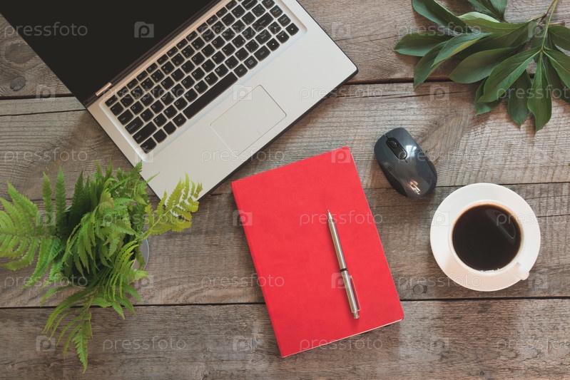 Открытый ноутбук с красным блокнотом на офисном столе