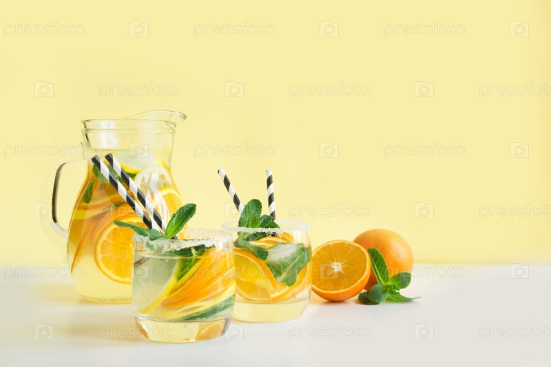 Свежий летний домашний лимонад с лимоном, апельсином и мятой на желтом фоне