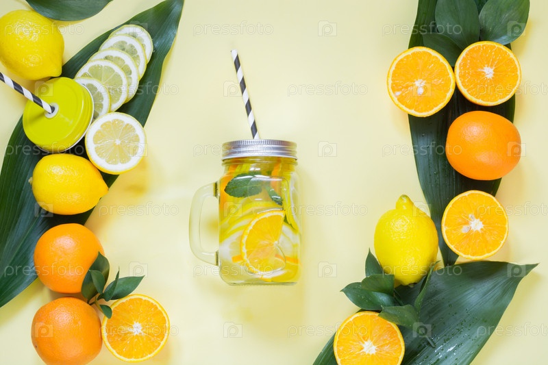 Летние фрукты и вода с лимоном, апельсином, мятой и льдом