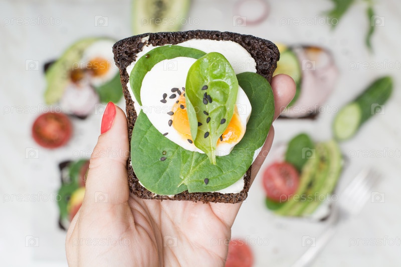 Один бутерброд со свежими летними овощами и яйцом в женской руке