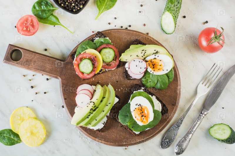 Летние бутерброды со свежими овощами, яйцами, авокадо, помидорами
