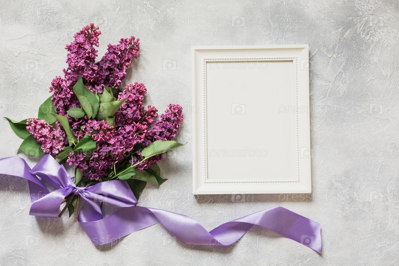 Букет из фиолетовых цветков сирени с рамкой и местом для текста. Вид сверху