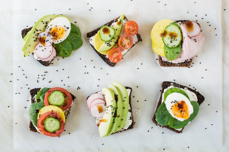 Летние бутерброды с овощами, яйцами, авокадо, помидорами