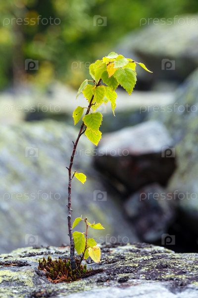 Небольшая береза растет на камне