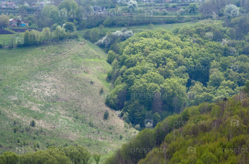 Весенний лес, овраг и деревня, Тернопольская область, Украина
