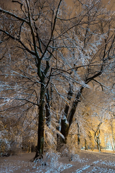 Большие заснеженные деревья в парке во Львове, Украина