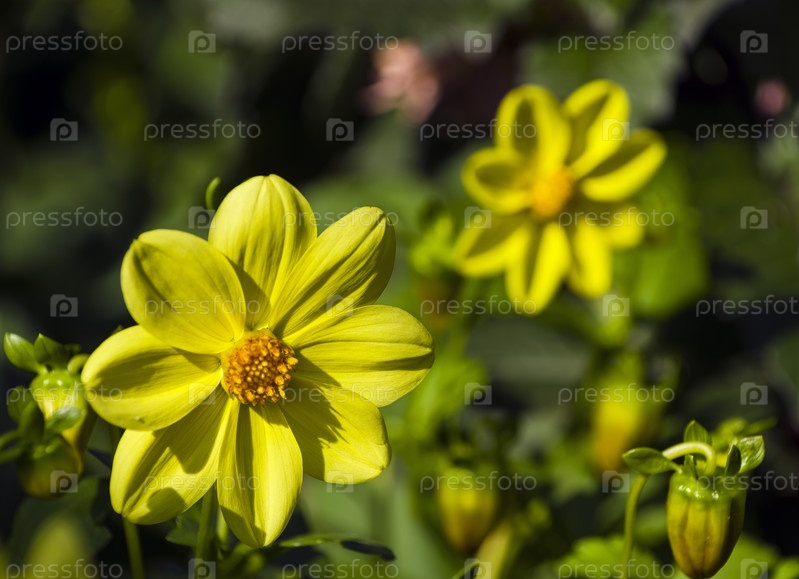 Желто-зеленые георгины под ярким сентябрьским солнцем