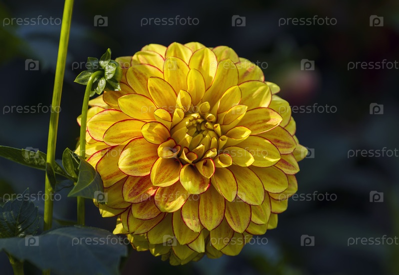 Яркая желто-красная георгина на темном фоне