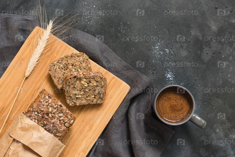 Свежий домашний ржаной хлеб и чашка черного кофе
