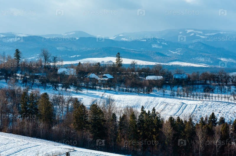 Зимний горный пейзаж с полем и деревней