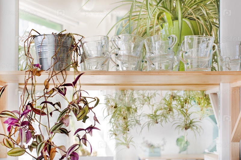 Ряд стеклянных кружек и комнатных растений